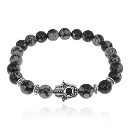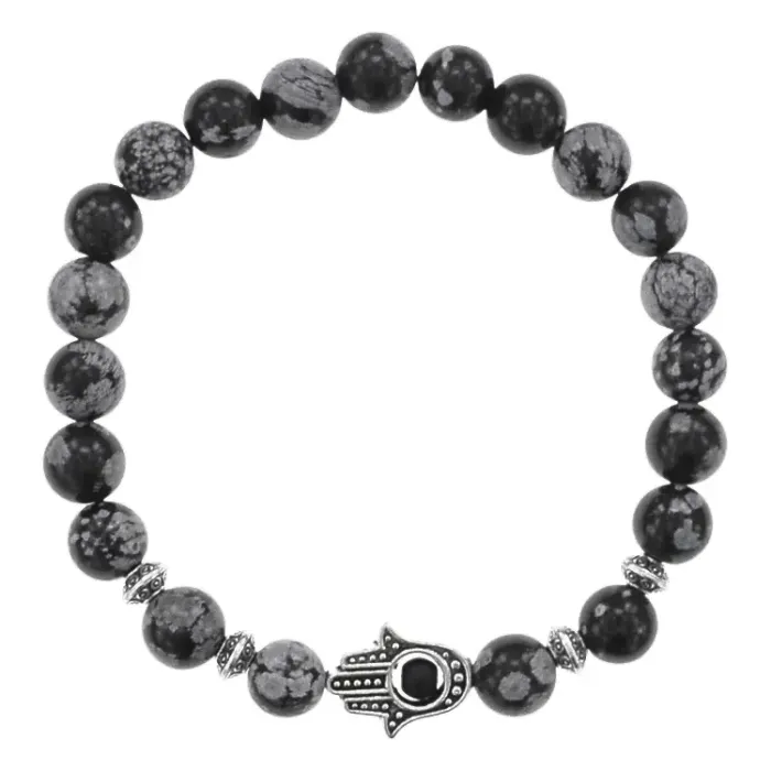 Браслет-амулет Хамса с нат. камнем Снежный обсидиан 8мм BSHE-S-14