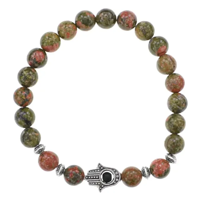 Браслет-амулет Хамса с нат. камнем Унакит 8мм BSHE-S-20