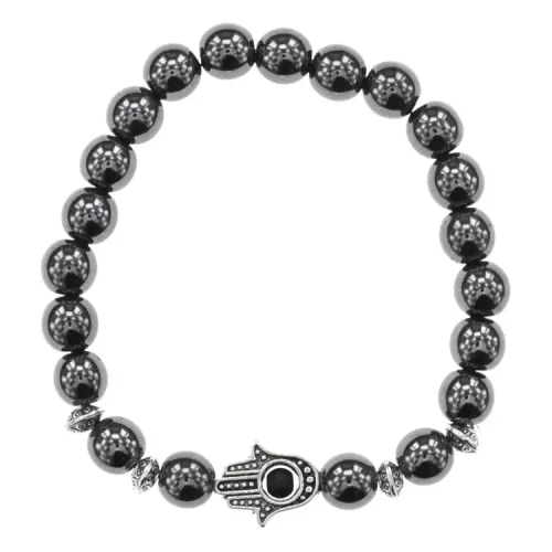 Браслет-амулет Хамса с синт. камнем Гематит (не магнит.) 8мм BSHE-S-28