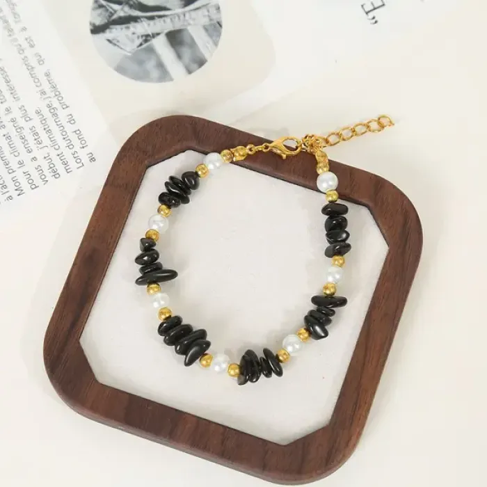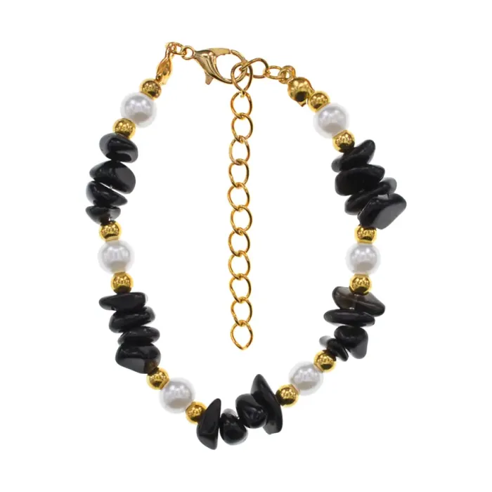 Браслет из бижутерного сплава с вставками искусственного жемчуга и натурального черного агата. Замок типа «лобстер».