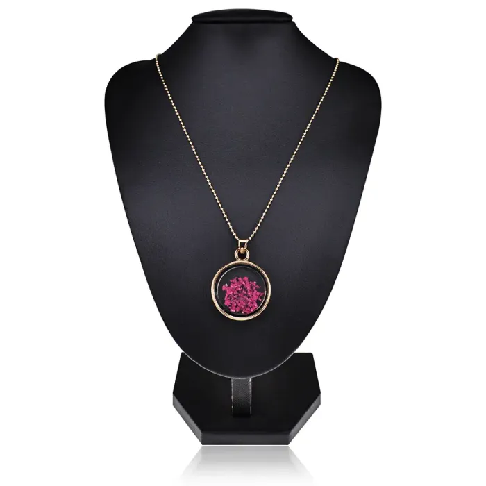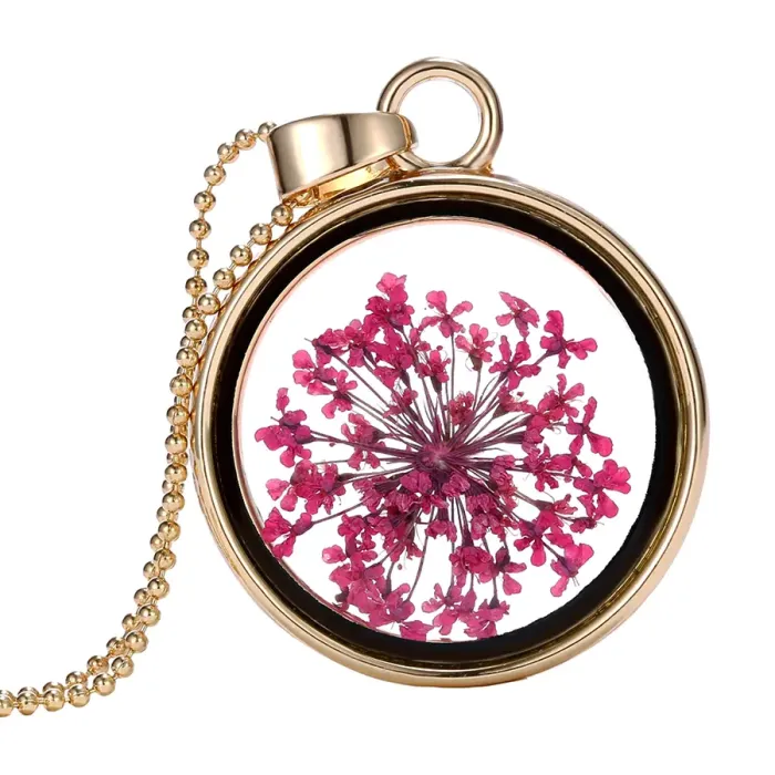 Кулон с сухими цветами внутри, выполненный из металла с золотым покрытием.