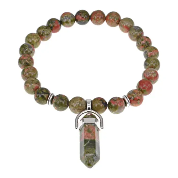 Стрейч-браслет с кристаллом из натурального камня унакит. Бусины диаметром 8 мм, размер кристалла 4х1,5 см.