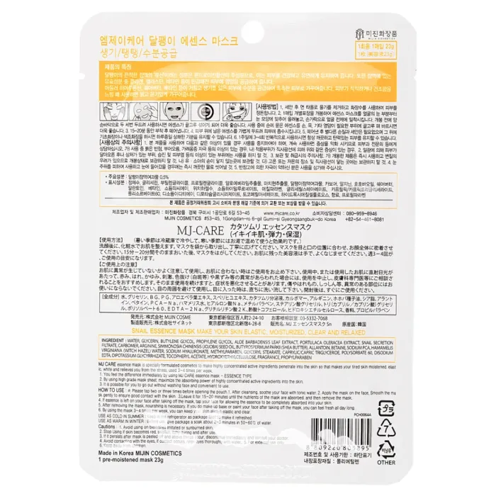 Маска Snail Essence Mask от Mijin — это эффективное средство для ухода за кожей лица, содержащее экстракт улиточной слизи. Известный своими омолаживающими и восстанавливающими свойствами, этот компонент помогает улучшить состояние кожи. Маска включает в себя гликолевую кислоту, аллантоин, коллаген, эластин и хитозан. Витамины А, С, Е, В6 и В12 обеспечивают антибактериальные и антиоксидантные эффекты. Эти ингредиенты способствуют увлажнению кожи, её восстановлению и обновлению структуры. Продукт подходит для чувствительной кожи и не вызывает аллергических реакций.