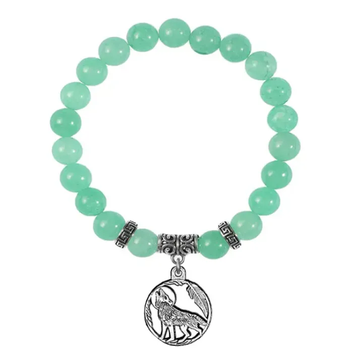 Браслет из натурального нефрита с подвеской-талисманом в виде волка из бижутерного сплава.