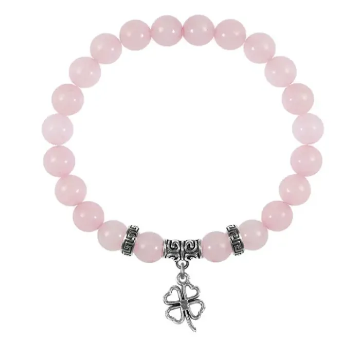 Браслет-амулет из натурального розового кварца с подвеской в виде клевера.