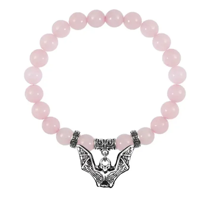 Браслет-амулет из натурального розового кварца с подвеской в виде летучей мыши из бижутерного сплава.