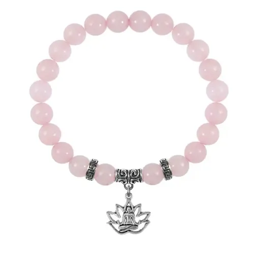 Браслет из натурального розового кварца с подвеской-талисманом в виде лотоса.