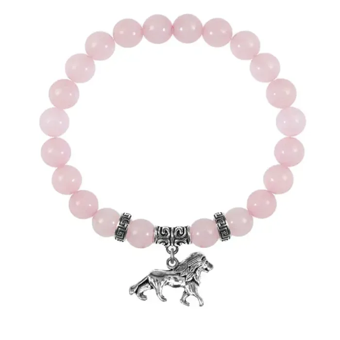 Браслет-амулет из натурального розового кварца с подвеской в виде льва из бижутерного сплава.