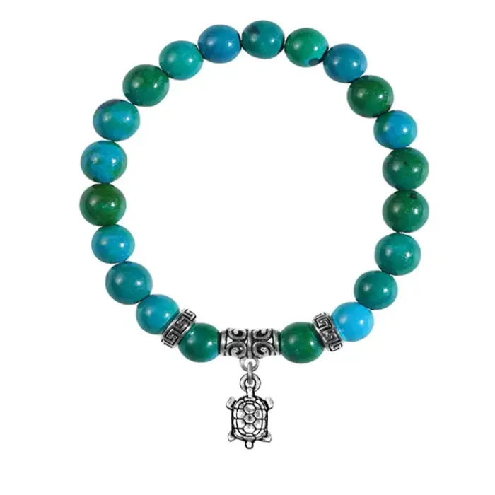 Браслет из синтетического камня хризоколла с подвеской в виде черепахи из бижутерного сплава.