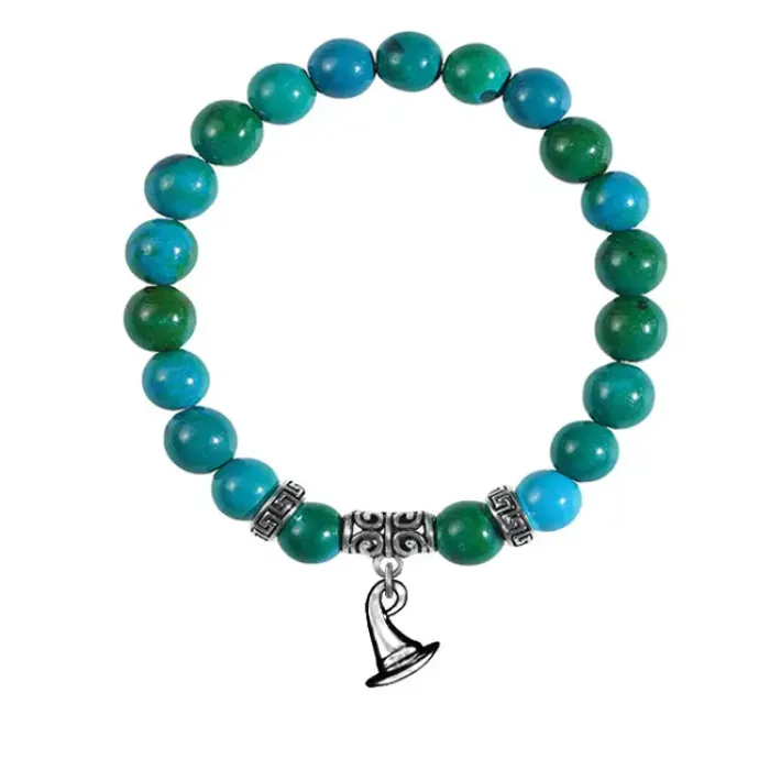 Браслет из синтетического камня хризоколла с подвеской-талисманом в виде шляпы.