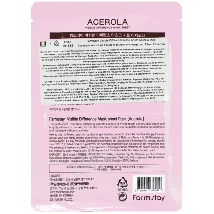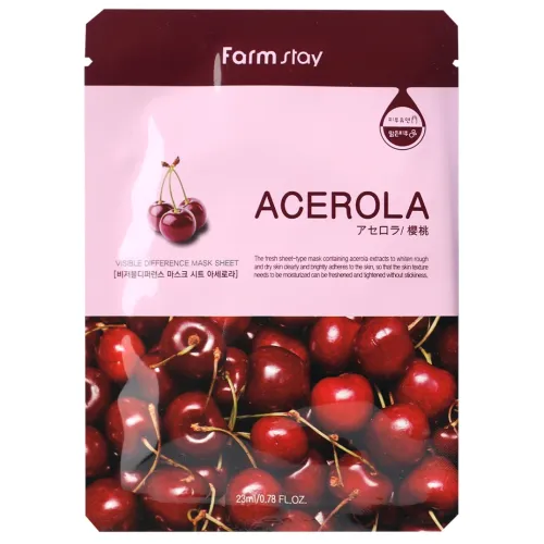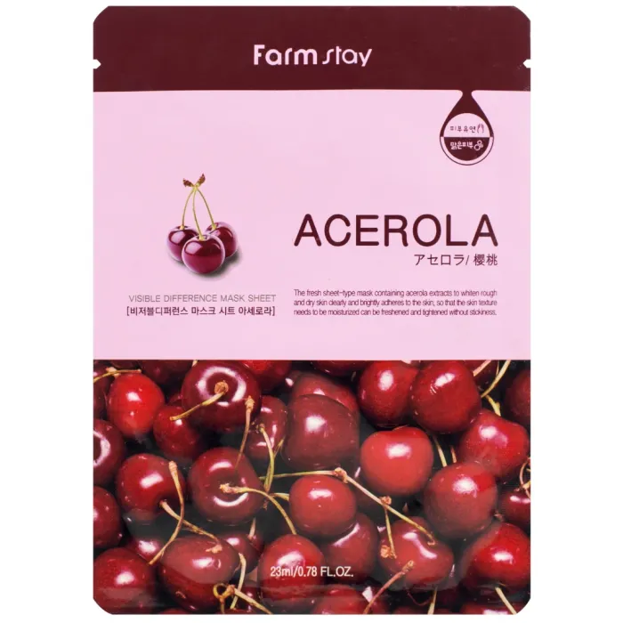 Тканевая маска с экстрактом ацеролы Visible Difference Mask Sheet Acerola от FarmStay объёмом 23 мл предназначена для эффективного ухода за кожей лица. Маска насыщает ткани кислородом, борется со свободными радикалами и способствует омоложению кожи. Она помогает уменьшить количество морщин, сужает поры и нормализует работу сальных желёз.
