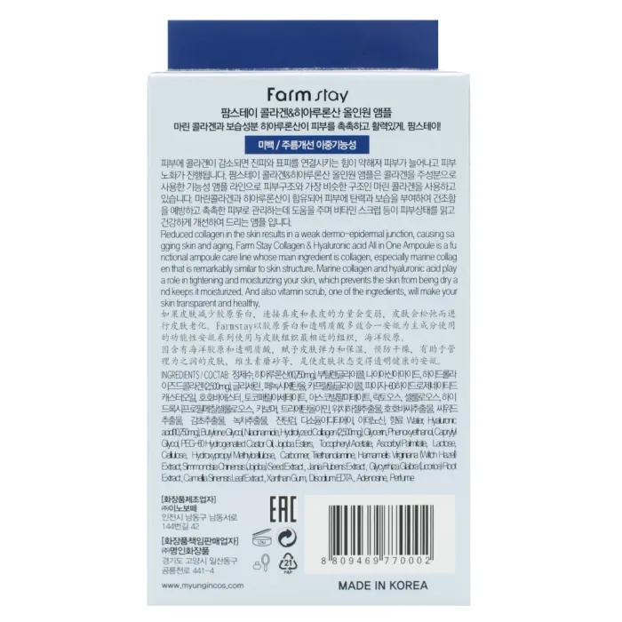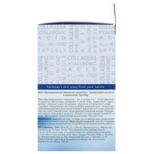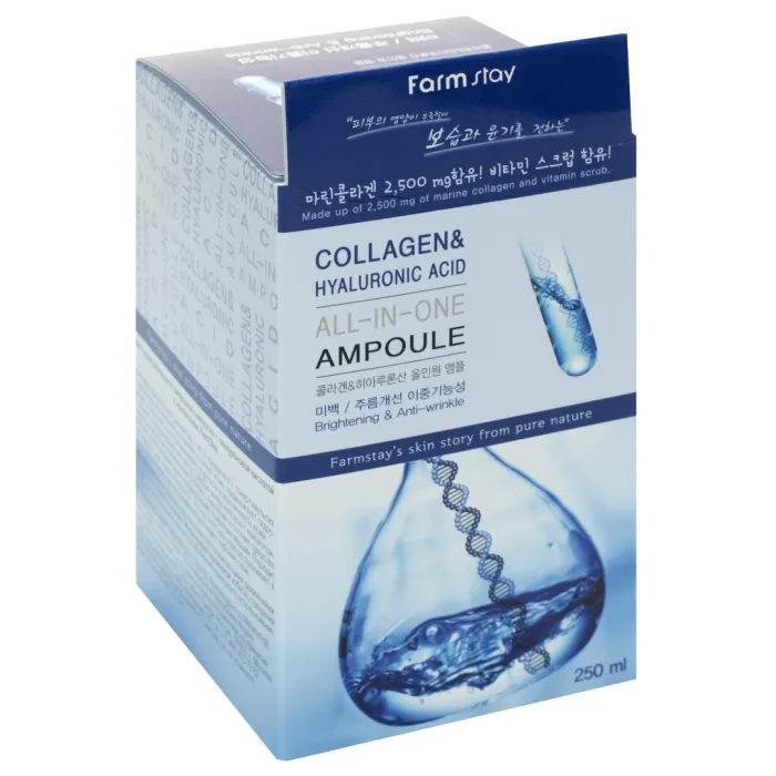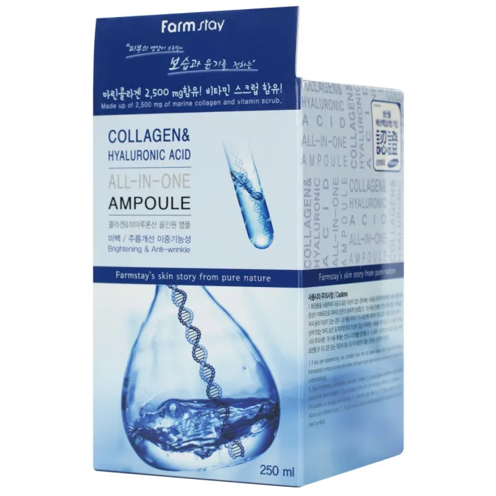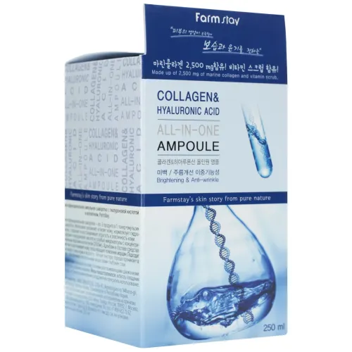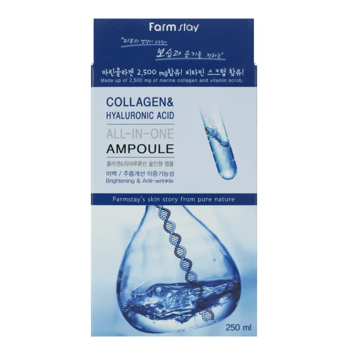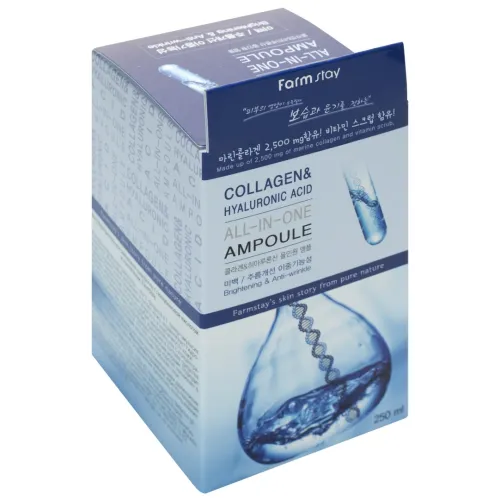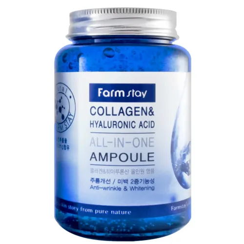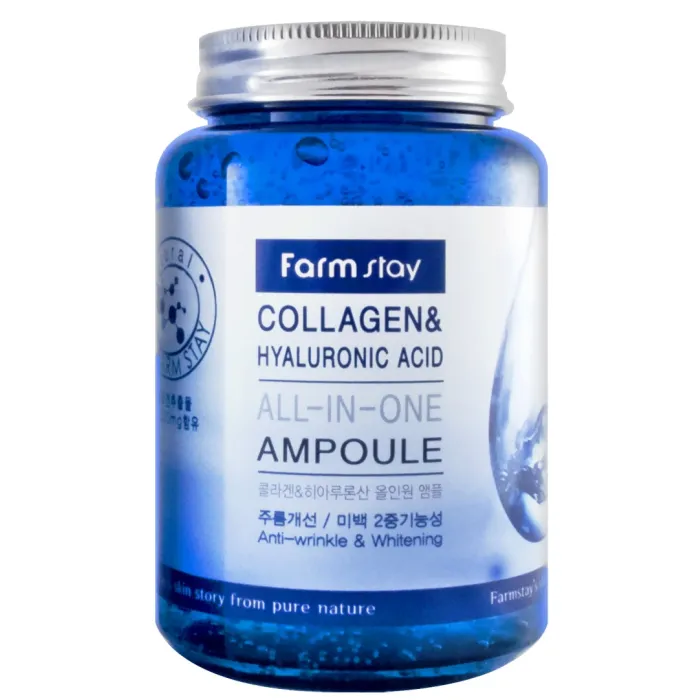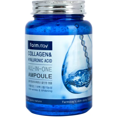 Сыворотка с гиалуроновой кислотой и коллагеном Collagen & Hyaluronic Acid All-In-One Ampoule от FarmStay — это мощное антивозрастное средство, предназначенное для интенсивного увлажнения и укрепления кожи. Средство эффективно разглаживает морщины и осветляет пигментацию. Лёгкая освежающая текстура сыворотки обеспечивает комфортное нанесение, мгновенно увлажняет кожу и визуально сглаживает несовершенства уже после первого применения.