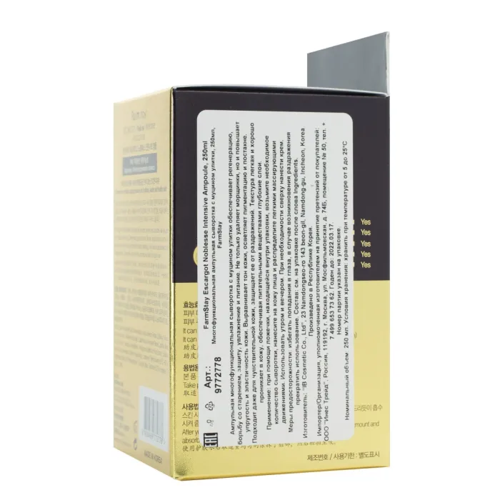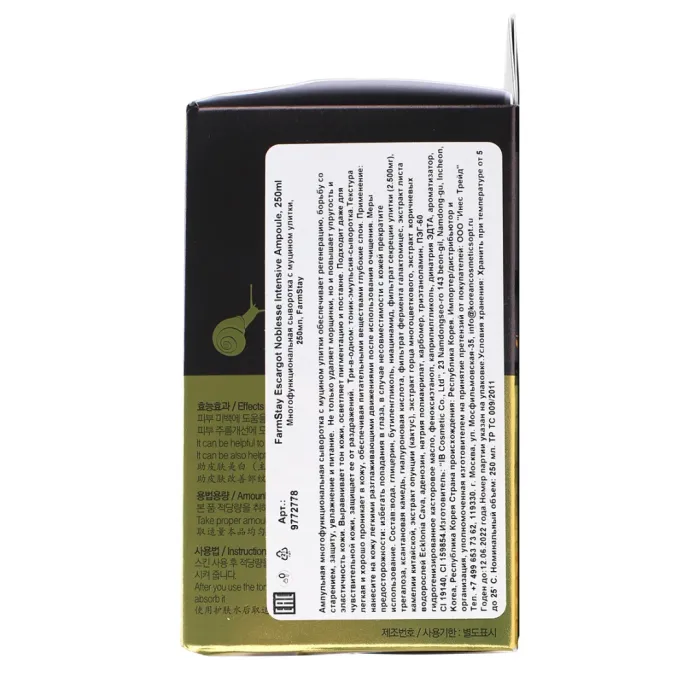 Состав: Water, Glycerin, Butylene Glycol, Niacinamide, Snail Secretion Filtrate (улиточная слизь), Trehalose, Xanthan Gum, Sodium Hyaluronate (гиалуроновая кислота), Galactomyces Ferment Filtrate (фермент галактомицес), Camellia Sinensis Leaf Extract (экстракт листьев камелии), Opuntia Coccinellifera (опунция), Polygonum Multiflorum Root Extract (экстракт корня горца многоцветкового), Ecklonia Cava Extract (экстракт эклонии кавы), Adenosine.