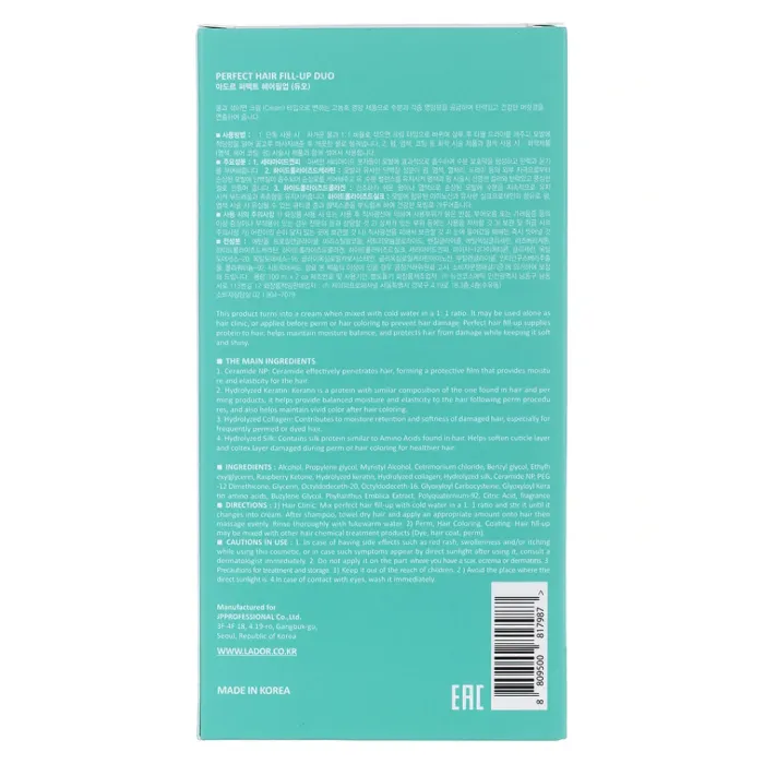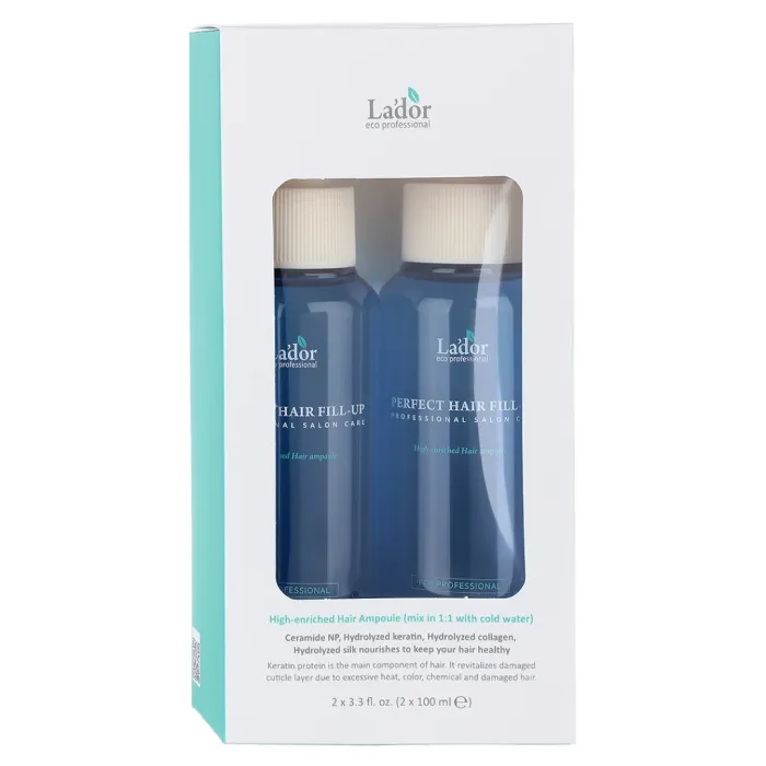 Филлер для волос PERFECT HAIR FILL-UP DUO от Lador предназначен для восстановления и улучшения состояния ослабленных и повреждённых волос. Средство нормализует pH-баланс кожи головы, лечит волосы после химических процедур или окрашивания, способствуя их оздоровлению и укреплению. В состав филлера входят активные компоненты, такие как гидролизованный кератин, коллаген и шёлк, а также керамид NP, которые питают волосы и восстанавливают их структуру.