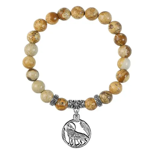 Браслет из натуральной песочной яшмы с подвеской-талисманом в виде волка.