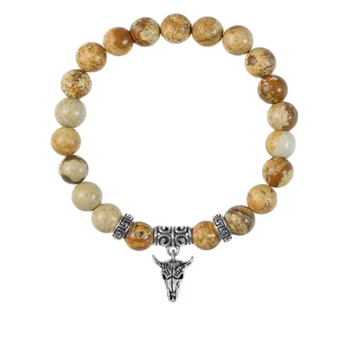 Браслет из натуральной песочной яшмы с подвеской в виде черепа быка из бижутерного сплава.