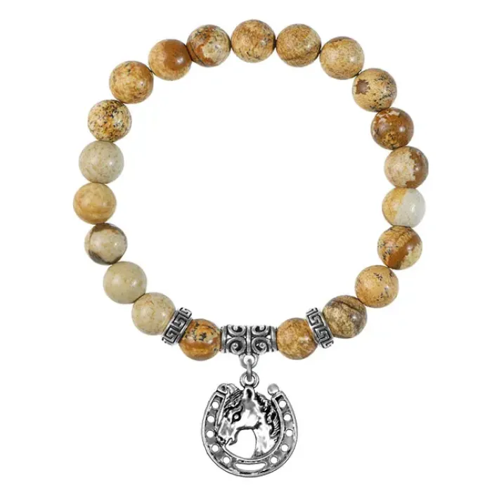 Браслет-амулет из натуральной песочной яшмы с подвеской в форме подковы из бижутерного сплава.
