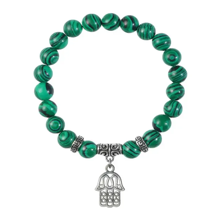 Браслет-амулет из синтетического малахита с подвеской-талисманом в виде Хамсы.