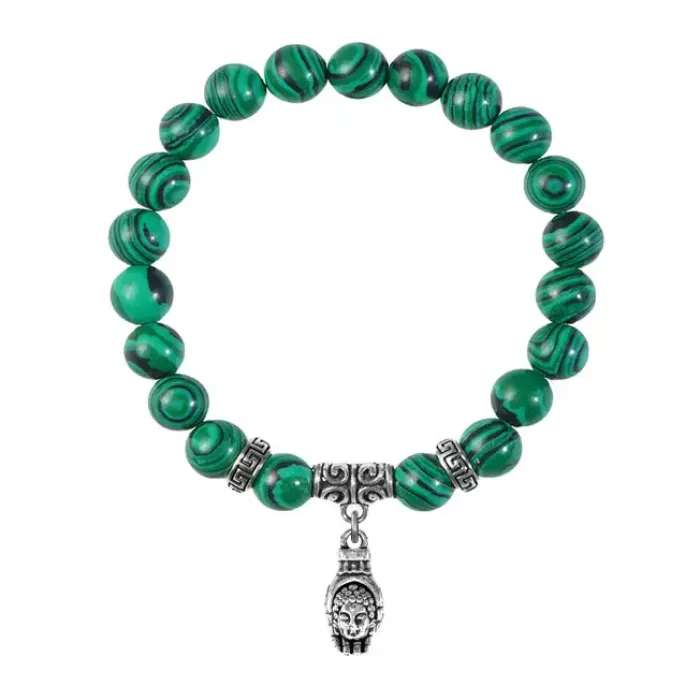 Браслет с подвеской в виде символа Рука Будды, выполненный из синтетического малахита и бижутерного сплава.