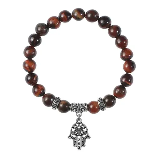 Браслет-амулет из натурального камня бычий глаз с подвеской в виде символа хамса.