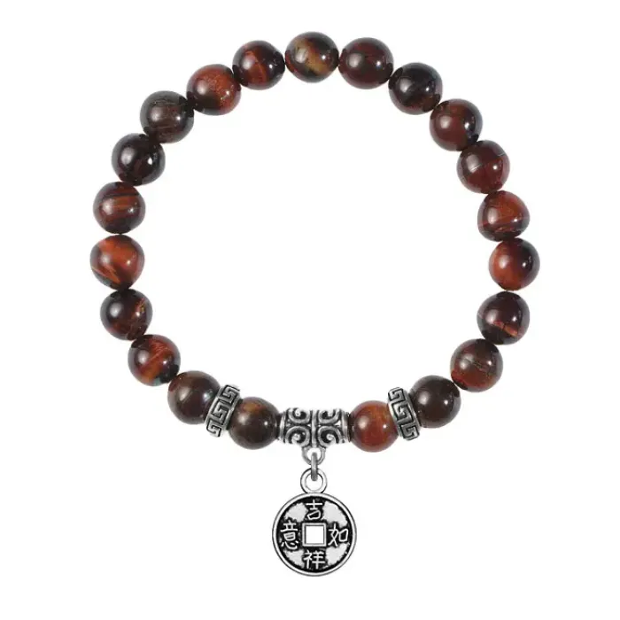 Браслет из натурального камня бычий глаз с подвеской в виде монеты из бижутерного сплава.