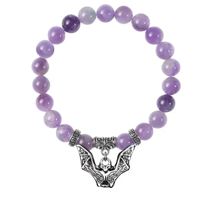Браслет-амулет из натурального аметиста с подвеской в виде летучей мыши из бижутерного сплава.