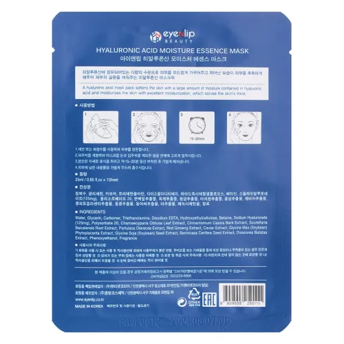 Тканевая маска для лица Hyaluronic Acid Moisture Essence Mask от Eyenlip предназначена для глубокого увлажнения и питания кожи. Основной компонент маски — гиалуроновая кислота, которая эффективно связывает воду в клетках, предотвращая её испарение через эпидермис. Это делает кожу более увлажнённой и мягкой на длительное время.