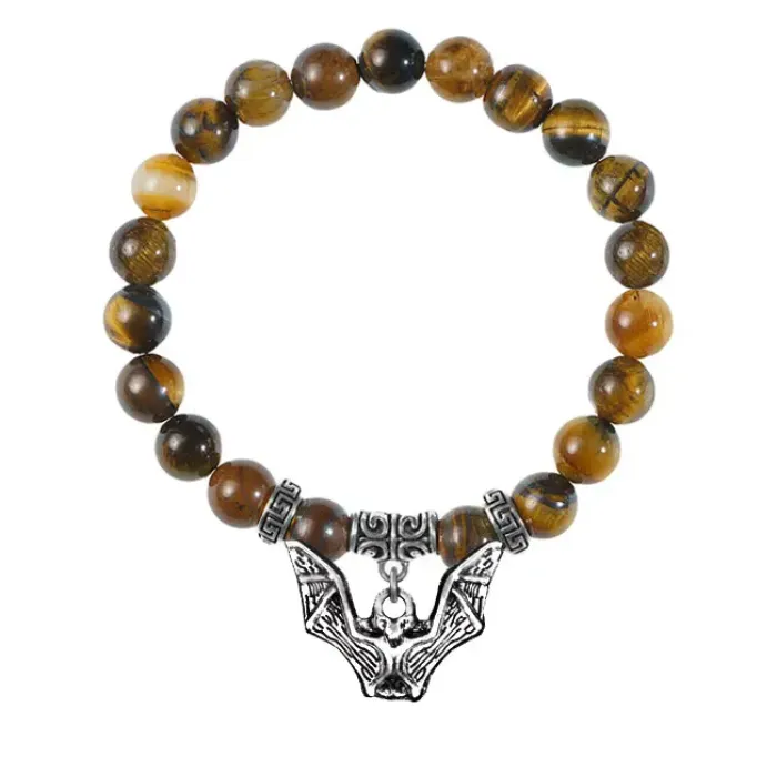Браслет-амулет из натурального камня тигровый глаз с подвеской в виде летучей мыши из бижутерного сплава.