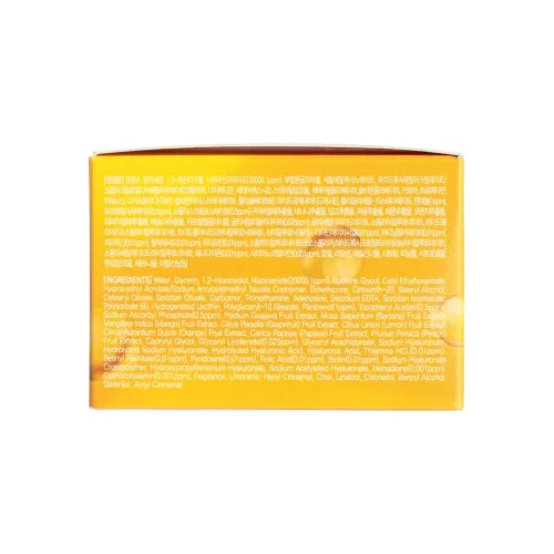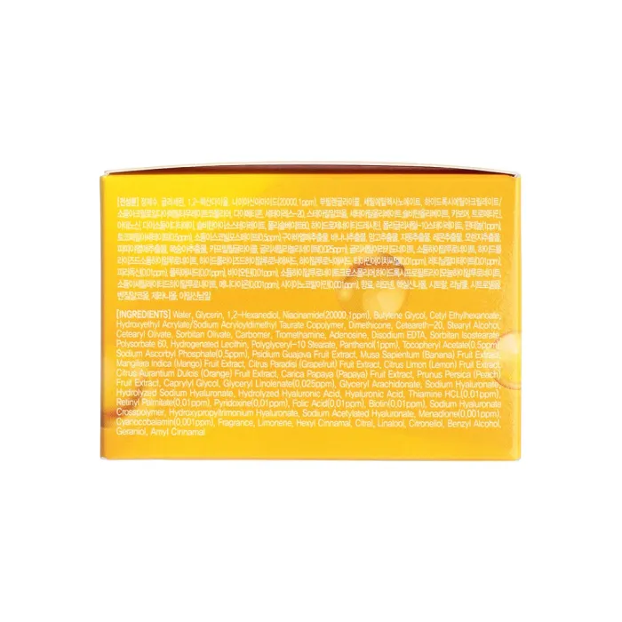 Состав: Niacinamide, hyaluronic acid, adenosine, panthenol; fruit extracts (guava, banana, mango, grapefruit, lemon, orange, papaya, peach); vitamins (folic acid, biotin; vitamin C,A,K,B1,B2,B6,B12).
