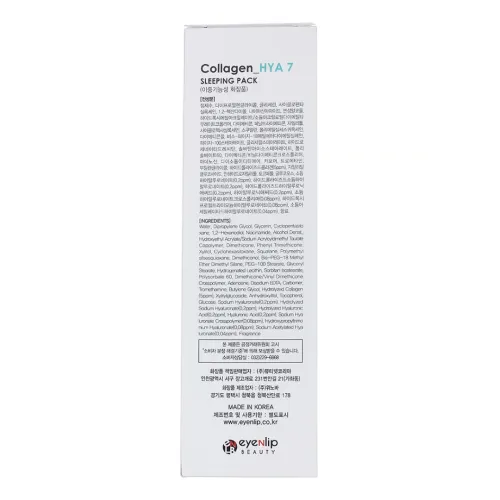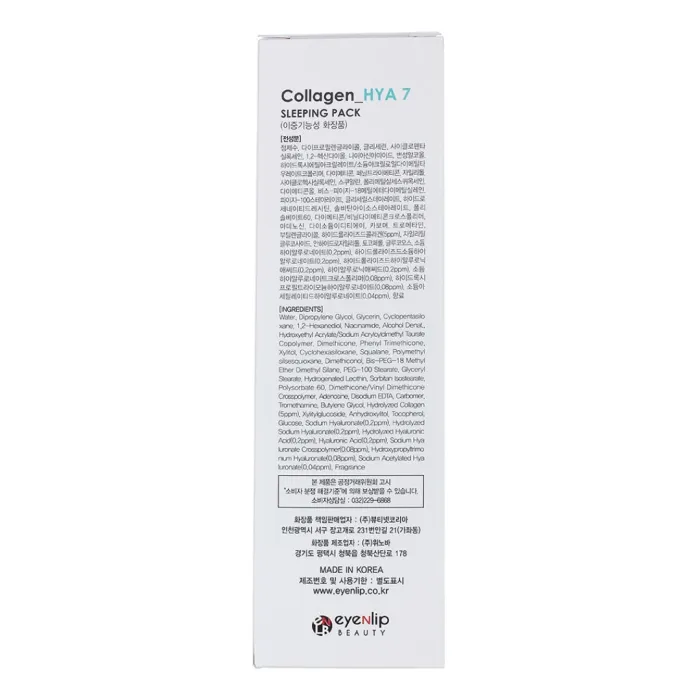Ночная маска с коллагеном и гиалуроновой кислотой Sleeping Pack Collagen HYA 7 от Eyenlip — это средство для интенсивного ухода за кожей во время сна. Маска содержит коллаген, извлечённый из рыбы, и семь видов гиалуроновой кислоты, которые обеспечивают кожу необходимыми питательными и увлажняющими компонентами на протяжении всей ночи.