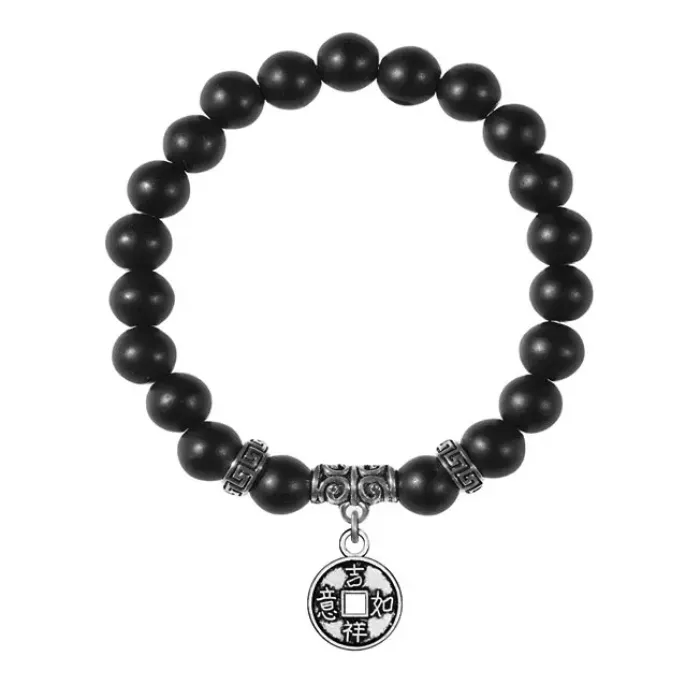 Браслет-амулет из синтетического шунгита с подвеской-талисманом в виде монеты.