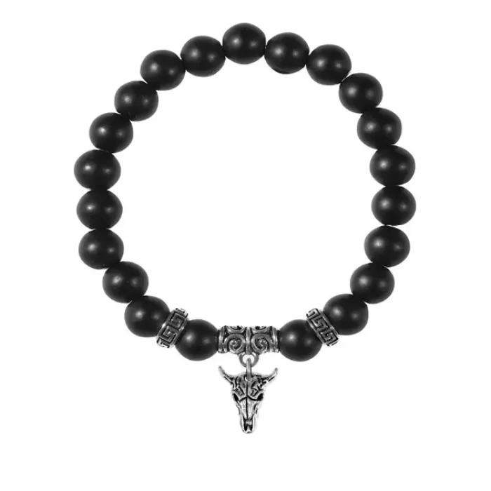 Браслет-амулет из синтетического шунгита с подвеской в виде черепа быка.