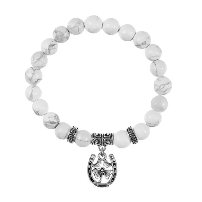 Браслет-амулет из натурального камня кахолонг с подвеской в виде подковы и клевера.