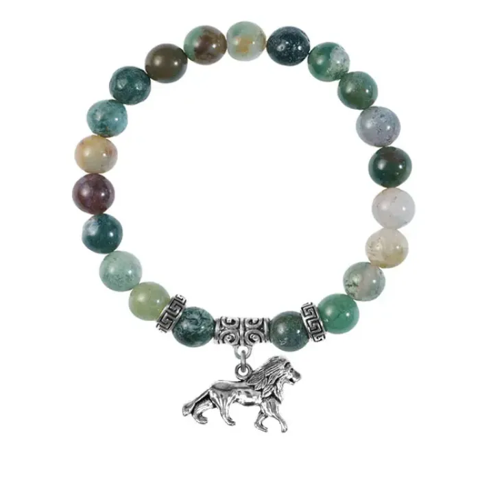Браслет-амулет из натуральной яшмы с подвеской в виде льва из бижутерного сплава.