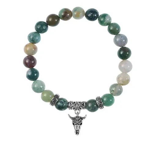 Браслет из натуральной яшмы с подвеской в виде черепа быка из бижутерного сплава.