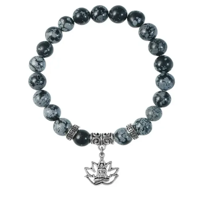 Браслет из натурального камня снежный обсидиан с подвеской-талисманом в виде лотоса.