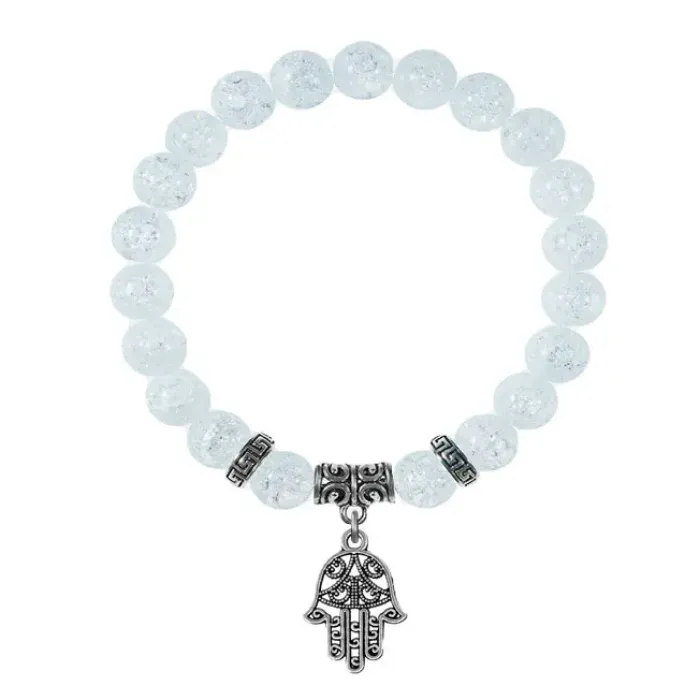 Браслет-амулет из синтетического сахарного кварца с подвеской в виде символа Хамса.