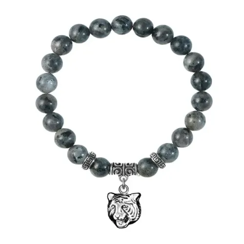 Браслет из натурального камня лабрадор с подвеской в виде тигра из бижутерного сплава.