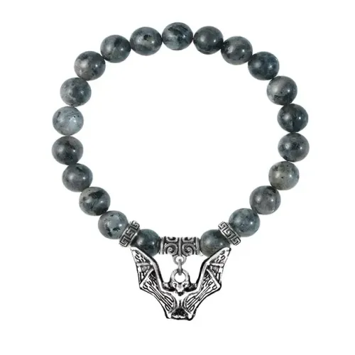 Браслет-амулет из натурального камня лабрадор с подвеской в виде летучей мыши из бижутерного сплава.