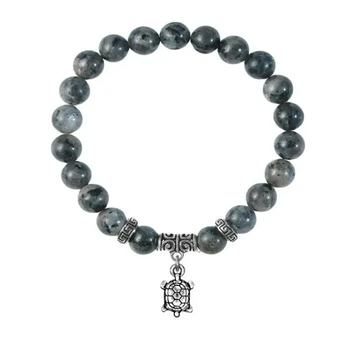 Браслет-амулет из натурального камня лабрадор с подвеской в виде черепахи из бижутерного сплава.