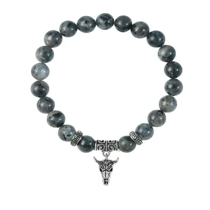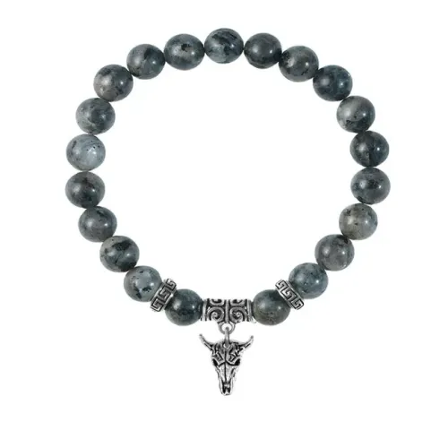 Браслет-амулет из натурального камня лабрадор с подвеской в виде черепа быка из бижутерного сплава.