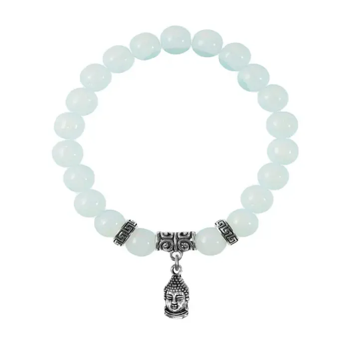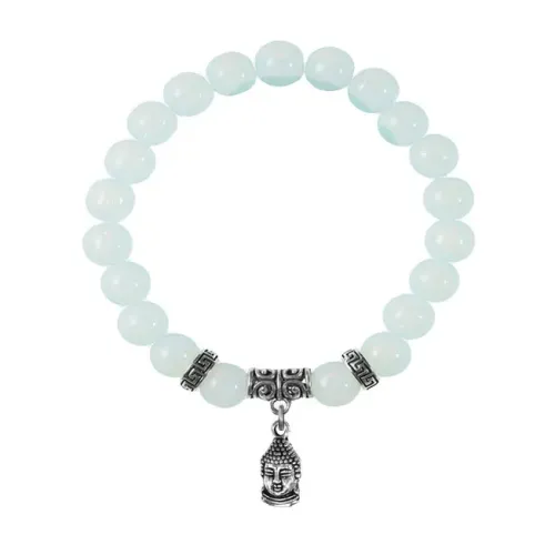 Браслет с подвеской-талисманом в виде Будды, выполненный из синтетического лунного камня (Опалит) и бижутерного сплава.