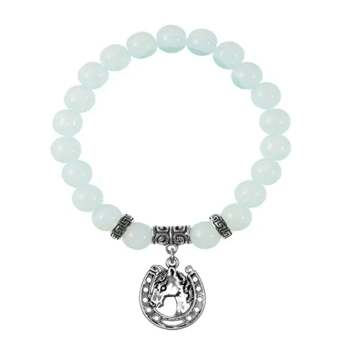 Браслет-амулет из синтетического лунного камня (опалита) с подвеской в виде подковы.