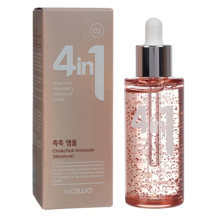 Сыворотка для лица с муцином улитки Dr.G50 4 In 1 Chokchok Ampoule Snail от Dr. Cellio — это эффективное средство для глубокого питания и увлажнения кожи. Основной компонент, фильтрат секрета улитки, обеспечивает пролонгированный увлажняющий эффект, способствует выравниванию кожного рельефа и улучшает общее состояние кожи. Сыворотка также содержит экстракты плодов черники и малины, которые богаты антиоксидантами и помогают защитить кожу от вредных воздействий окружающей среды.