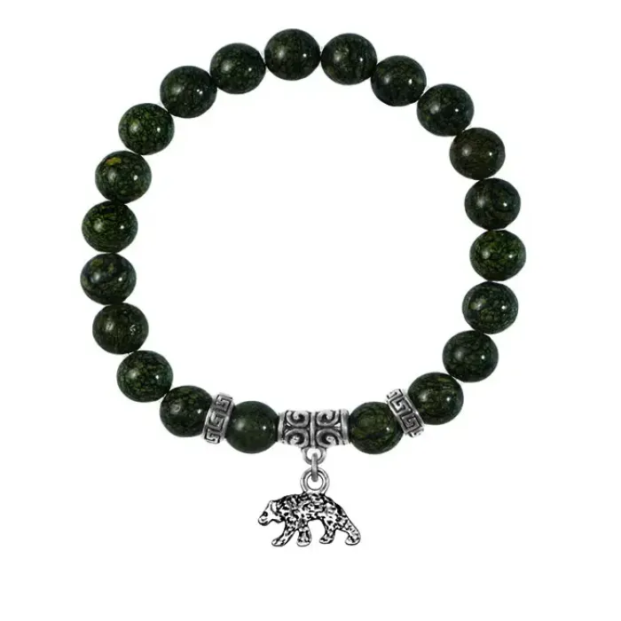 Браслет из натурального камня змеевик с подвеской-талисманом в виде медведя.