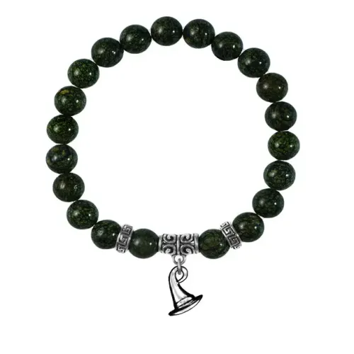 Браслет из натурального камня змеевик с подвеской-талисманом в виде шляпы.