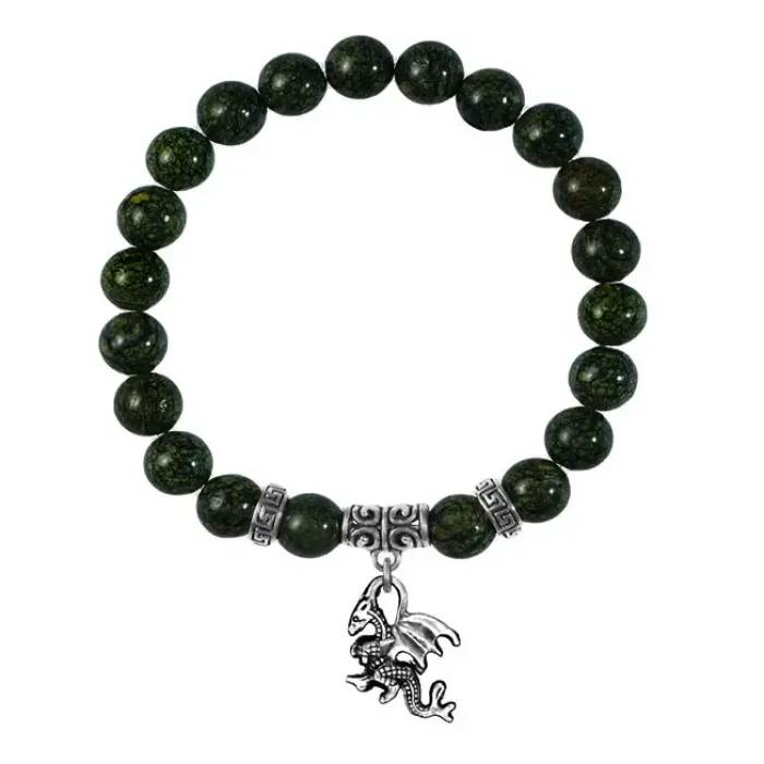Браслет из натурального камня змеевик с подвеской в виде дракона.