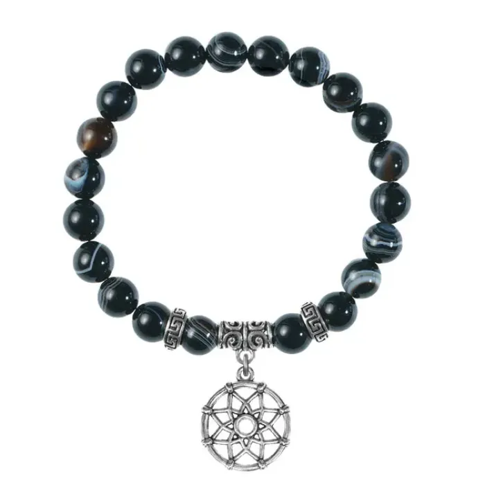 Браслет-амулет из натурального чёрного агата с подвеской из бижутерного сплава.