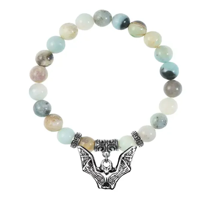 Браслет из натурального амазонита с подвеской в виде летучей мыши из бижутерного сплава.