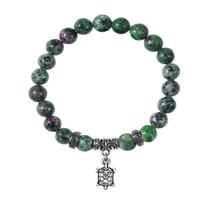 Браслет из синтетического камня цоизит с подвеской в виде черепахи из бижутерного сплава.
